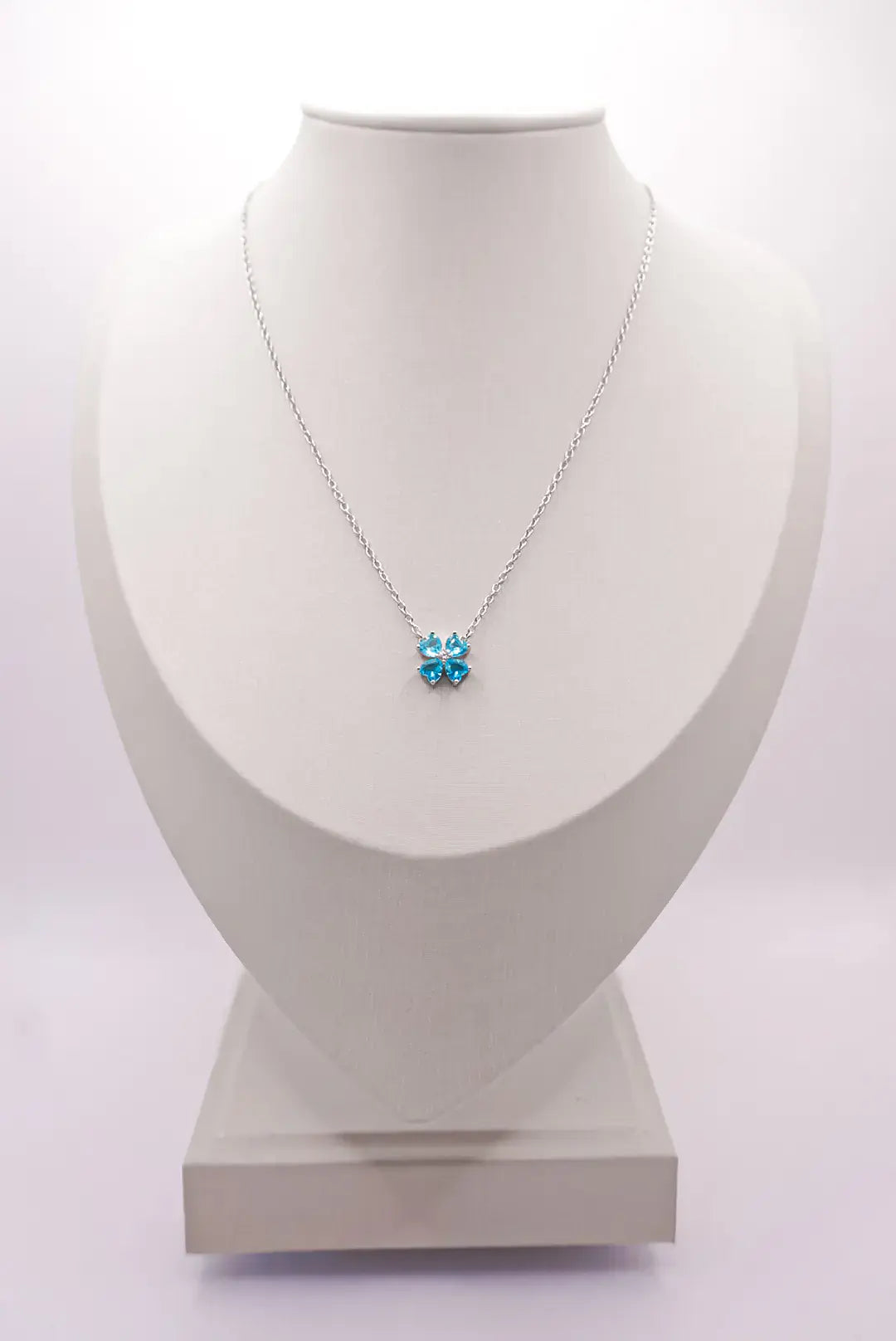 Fresh luminosity. Regal elegance. The Alboni Clover Necklace brings soft colour and refined structure together in a graceful composition. Four heart-cut aquamarine stones form a sculpted clover silhouette, creating a delicate yet distinctive presence that captures light with cool, serene brilliance. Crafted in solid 925 sterling silver and finished in white rhodium plating, the design allows the natural clarity and luminous blue tone of aquamarine to take centre stage. Elegant in scale yet composed in structure, the piece adds a subtle statement to everyday styling while remaining refined enough for elevated occasions. Aquamarine has long been associated with royal elegance and was one of the gemstones most admired by Queen Elizabeth II, who was often seen wearing remarkable aquamarine jewels throughout her reign. Graceful. Modern. Distinct.